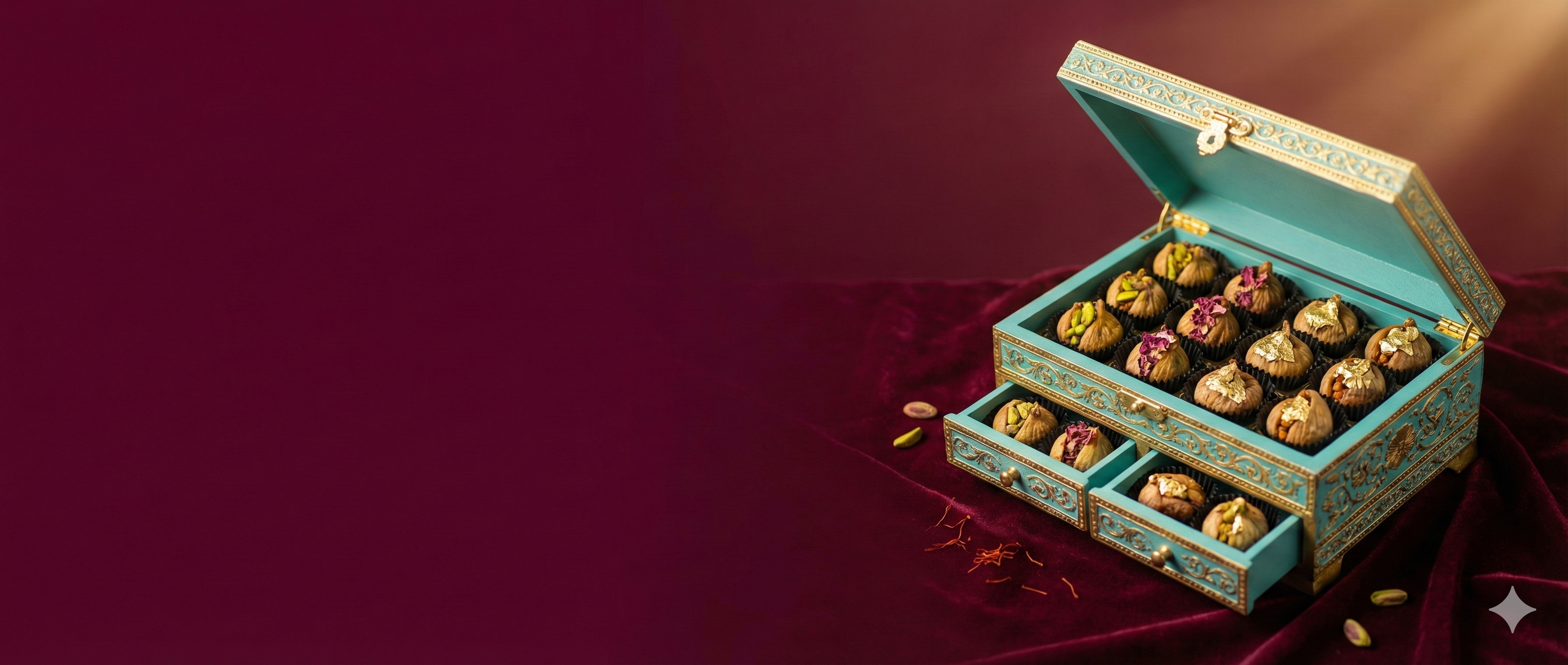 Four handcrafted fig confections nestled in a Mughal-inspired keepsake chest with hidden drawers, designed to be gifted, unwrapped slowly, and savored completely.